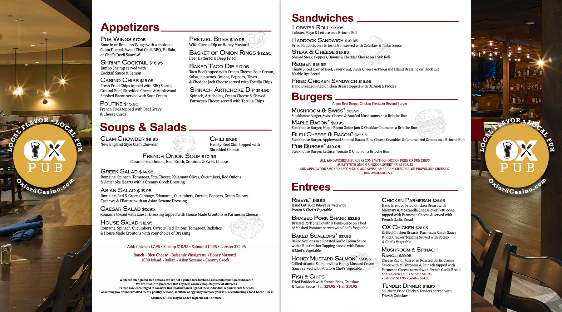 OX Pub is where American-style comfort food takes center stage. Known for our delicious burgers, weekly specials, and a menu that is both elegant and approachable, OX Pub offers a true taste of Maine. When you’re craving a juicy burger, a hearty meal, or a quick bite, we’ve got something to satisfy every appetite. Come relax, enjoy great food, and experience the best of Maine’s flavors at OX Pub – where quality and community come together.